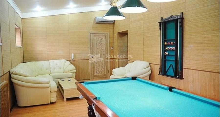 В нашей сауне имеется все для вашего полноценного отдыха – комната для гостей, с камином, телефоном, плазменным телевизором, магнитофоном, бассейном, обливным ведром. Наша сауна с сухим паром, оснащенная электрическим подогревом камней. Также в сауне имеется маленькая спа-комната с ванной на 6 человек, в которой можно воспользоваться гидромассажем. Любители бильярда смогут провести время в отдельной комнате за любимой игрой.